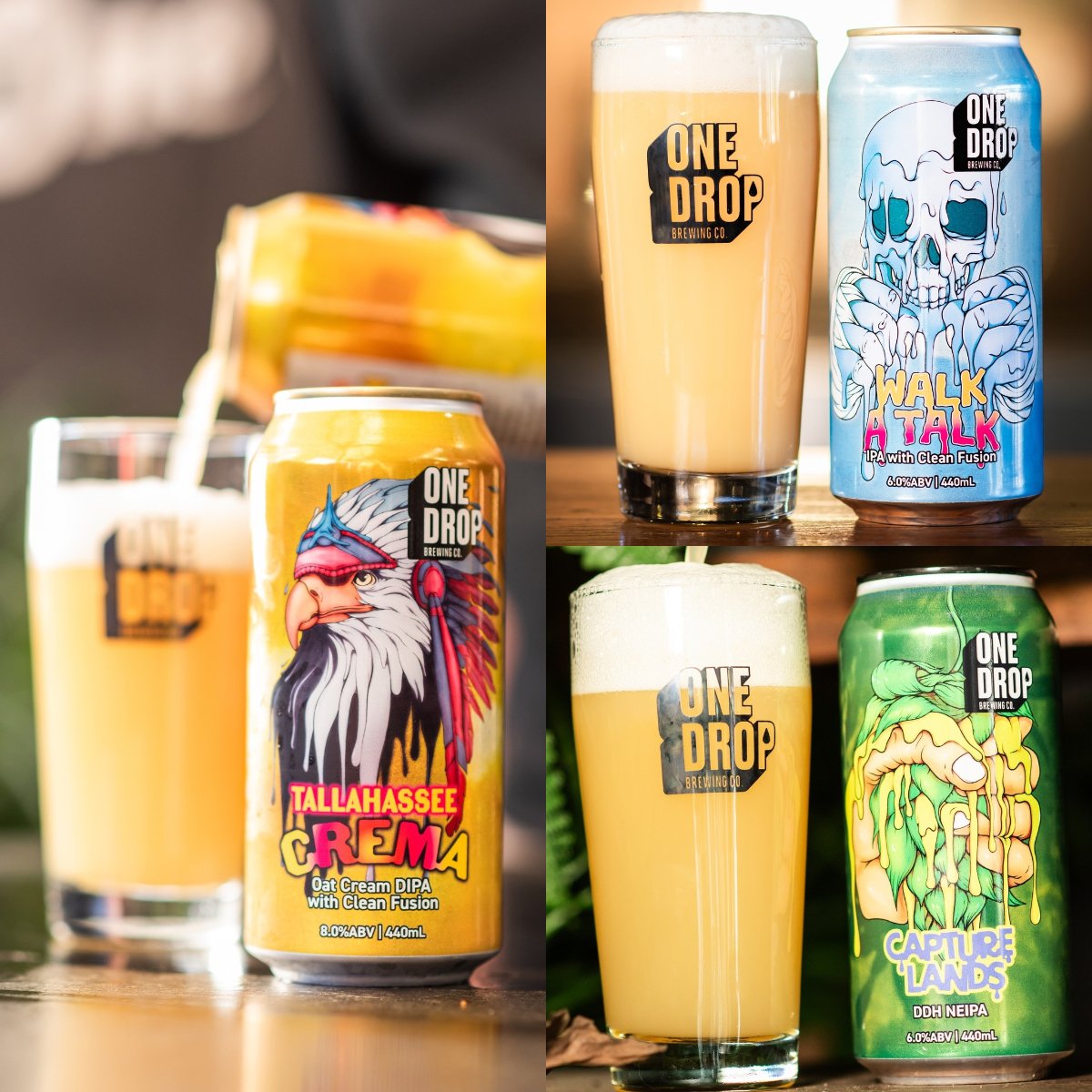 ⭐WALK A TALK Walk a Talk is a clean, easy, hop-forward Hazy IPA that’s not just all talk. Built on a crisp, modern malt base and a laid-back fermentation profile, this beer lets the hops do all the flexing. We hit the cool pool with a high-impact combo of Citra, Nectaron CRYO®, and Nelson Sauvin—three hop powerhouses dishing out notes of tropical punch, ripe stone 一fruit, lychee, and sauv blanc spritz. Then we Double Dry Hopped the thing just to make sure you smell it before you even sip it. Juicy, bright, and dripping with hop charisma. Whether you’re waxing poetic or kicking back in silence, Walk a Talk speaks volumes innit. Hazy IPA 440ml 6% ABV ⭐CAPTURE LANDS Capture Lands is a brand‑new NEIPA built on a lean malt base and stacked in the cool pool with Freestyle Southern Cross laying down a solid foundational position. Double Dry Hopped with the best hoppy nose candy Aussie dollars can buy—Eggers Rakau bringing ripe apricot, Krush throwing juicy mango, Lily giving soft floral lift, Peacharine delivering sweet stonefruit, and Citra firing off zesty lime to the tropics. We on. DDH NEIPA 440ml 6% ABV ⭐TALLAHASSEE CREMA We’re still at it. This time it’s a big fat double Oat Cream IPA built on a single, silky dose of our infamous Multi‑stack Oats™. Upon that lush base, our refined house Hazy Yeast™ went to work on a fresh lineup of HBC 1019, Superdel ic, Motueka, and Eggers Special hops. Then we brought in the real troublemaker— BEGA® Lactose—to send your calorie counter into freefall. The result? A smooth, fruit‑laced, NZ‑hopped IPA dripping with notes of peach rings, mango loll ies, and piña colada creaminess. A cold summer in a can, brewed with liquid love and made to drink right now. Oatcream DIPA 440ml 8% ABV